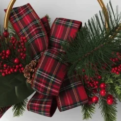 13″ Metal Horn With Greenery And Plaid Bow Artificial Christmas Wreath Green/Red – Wondershop™